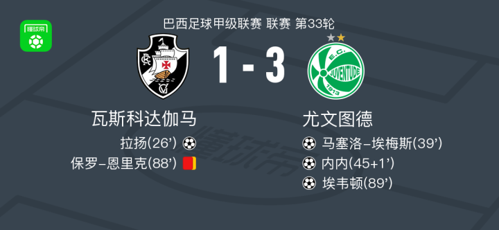 北京时间11月9日巴西足球甲级联赛 联赛 第33轮,瓦斯科达伽马主场对阵尤文图德。瓦斯科达伽马拉扬破门。尤文图德马塞洛-埃梅斯破门,内内破门,埃韦顿破门。最终比分瓦斯科达伽马 1-3 尤文图德。