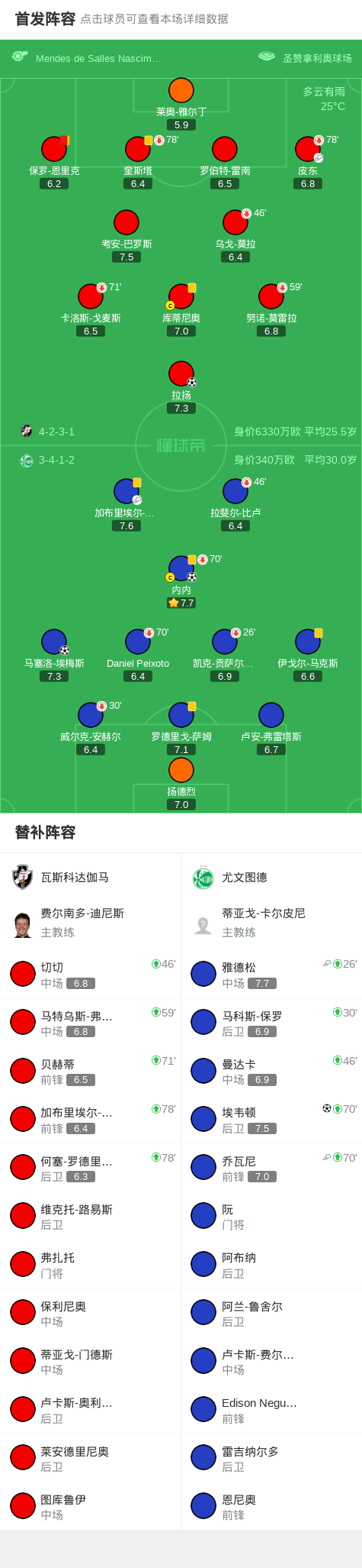 第26分钟,瓦斯科达伽马球员皮东助攻拉扬打入一球。