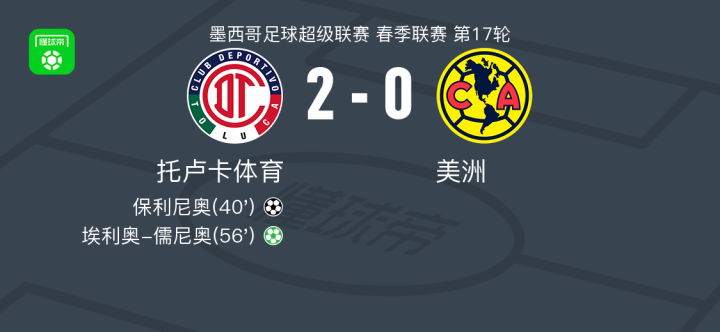 托卢卡体育2-0美洲,保利尼奥破门,埃利奥-儒尼奥锦上添花
