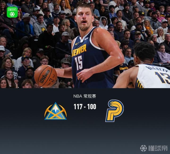 掘金117-100轻取步行者,约基奇32+14+14+8失误,内史密斯25分