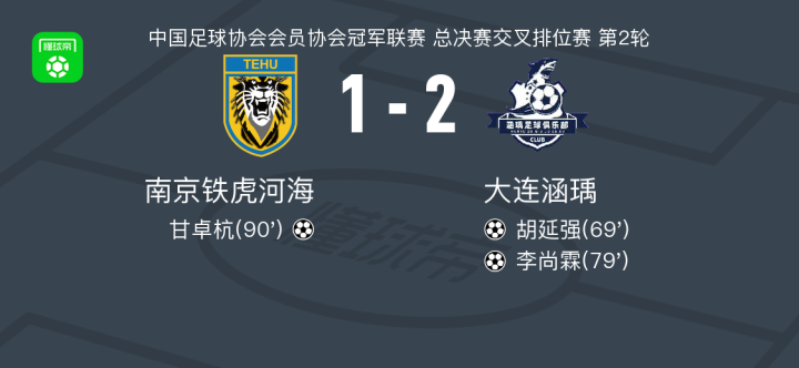 北京时间11月9日,中国足球协会会员协会冠军联赛总决赛交叉排位赛第二轮,南京铁虎河海主场迎战大连涵瑀。比赛中,大连涵瑀率先由胡延强取得进球,随后李尚霖再下一城,扩大领先优势。比赛尾声阶段,南京铁虎河海由甘卓杭扳回一球。最终全场比赛结束,南京铁虎河海以1比2不敌大连涵瑀。