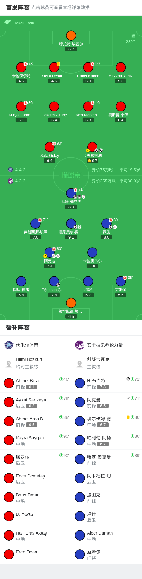 北京时间11月9日土耳其足球甲级联赛 联赛 第13轮,代米尔体育主场对阵安卡拉凯乔伦力量。代米尔体育卡夫拉兹利梅开二度。安卡拉凯乔伦力量罗施破门,马姆-迪乌夫梅开二度,Oğuzcan Çalışkan破门,H-布卢特破门,儒尼奥尔-费尔南德斯梅开二度。最终比分代米尔体育 2-7 安卡拉凯乔伦力量。
