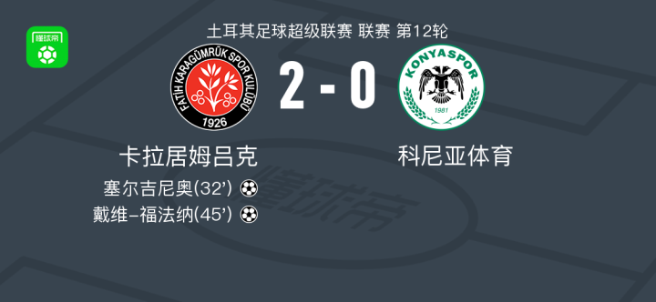 北京时间11月9日土耳其足球超级联赛 联赛 第12轮,卡拉居姆吕克主场对阵科尼亚体育。卡拉居姆吕克塞尔吉尼奥破门,戴维-福法纳破门。最终比分卡拉居姆吕克 2-0 科尼亚体育。