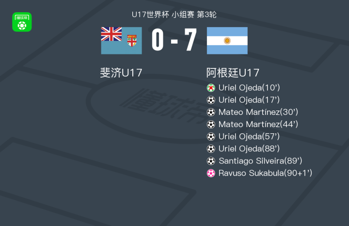 北京时间11月9日U17世界杯 小组赛 第3轮,斐济U17对阵阿根廷U17。斐济U17Ravuso Sukabula自摆乌龙。阿根廷U17Uriel Ojeda帽子戏法,Mateo Martínez梅开二度,Santiago Silveira破门。最终比分斐济U17 0-7 阿根廷U17。