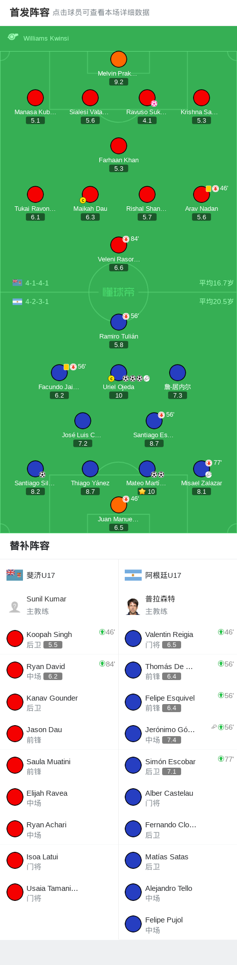 阿根廷U17 7-0狂胜斐济U17,Uriel Ojeda帽子戏法,Mateo Martínez双响