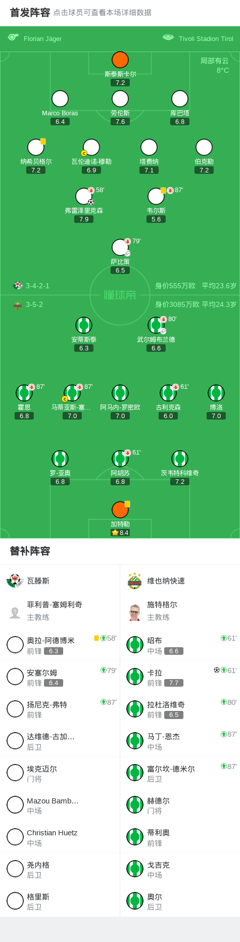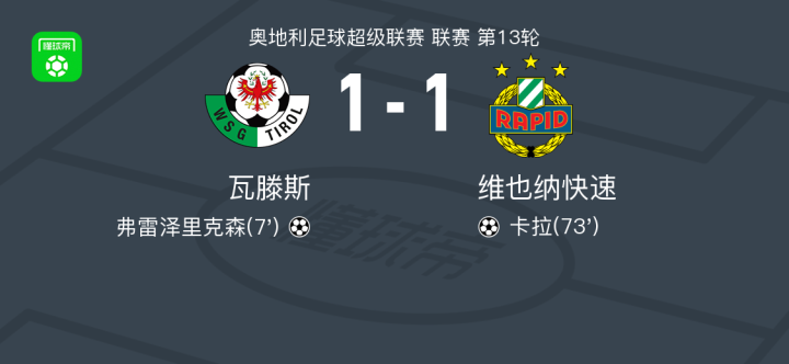 瓦滕斯1-1维也纳快速,弗雷泽里克森破门,卡拉救主
