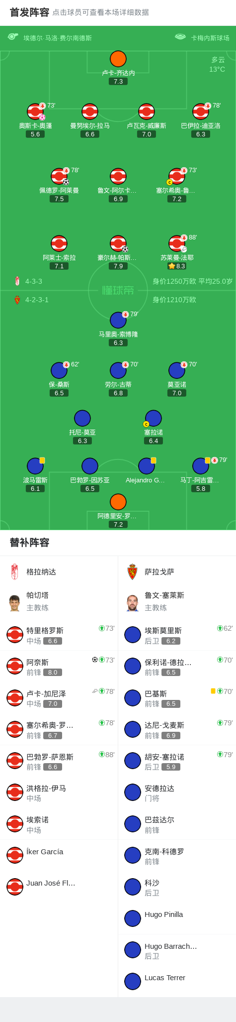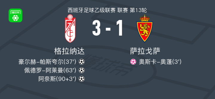 格拉纳达3-1逆转萨拉戈萨,阿奈斯建功,佩德罗-阿莱曼破门
