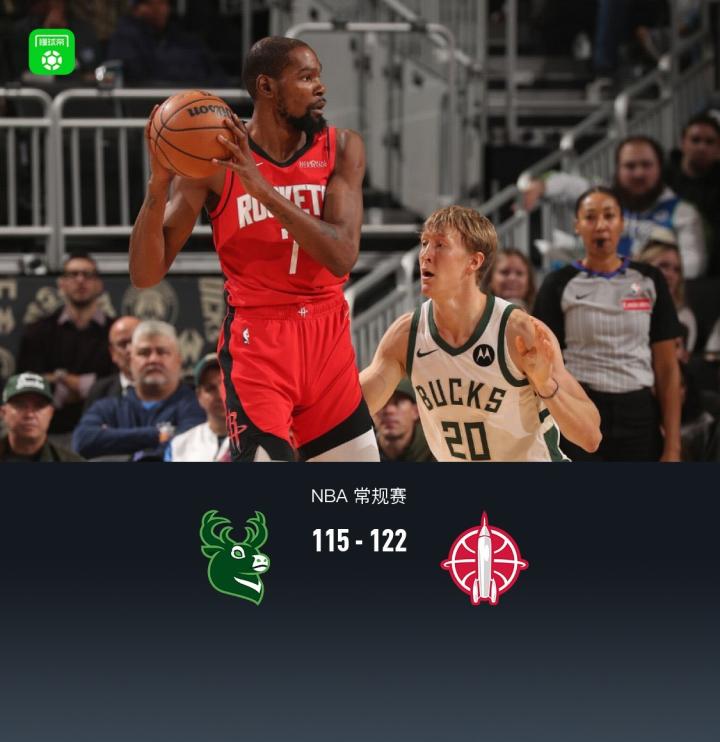 火箭122-115力克雄鹿,杜兰特31+7,字母哥空砍36+8