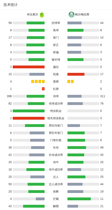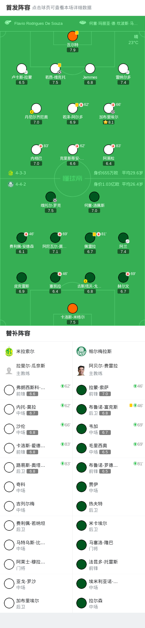 北京时间11月10日巴西足球甲级联赛 联赛 第33轮,米拉索尔主场对阵帕尔梅拉斯。米拉索尔加布里埃尔破门,若昂-维克托破门。帕尔梅拉斯维托尔-罗克破门。最终比分米拉索尔 2-1 帕尔梅拉斯。