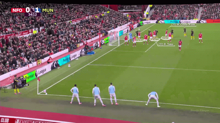 另一个例子来自本月2-2战平诺丁汉森林的客场比赛。对手采用纯粹的区域防守,内科-威廉斯、耶茨和吉布斯-怀特负责防守后点区域。