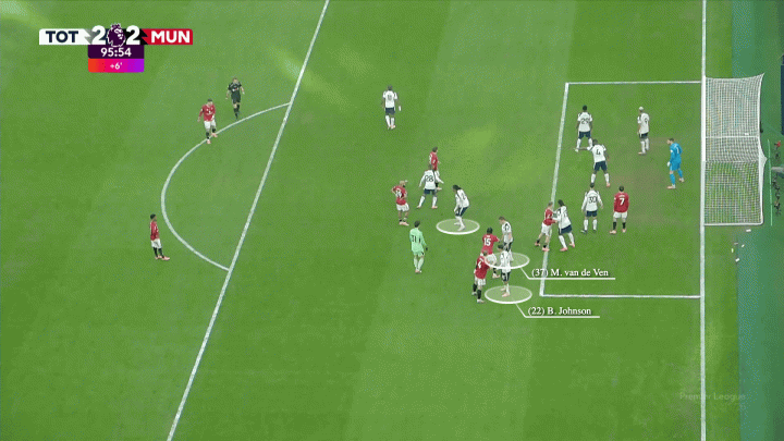一旦曼联队长开出角球,德利赫特改变方向冲向后点,约罗移向中央区域,芒特则卡在了热刺门将维卡里奥的身前。