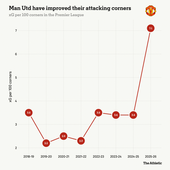 2025-26赛季曼联进攻角球的改进得到了底层数据的支持。从球队每100次角球的xG来看,他们目前7.1的数据是过去七个英超赛季中任意一个赛季的两倍多。