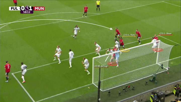 当姆伯莫将内旋角球开向后点时,卢克-肖在那个区域牵制住了富勒姆的区域防守球员罗德里戈-穆里斯。相应地,约罗在目标区域内与巴锡形成一对一。