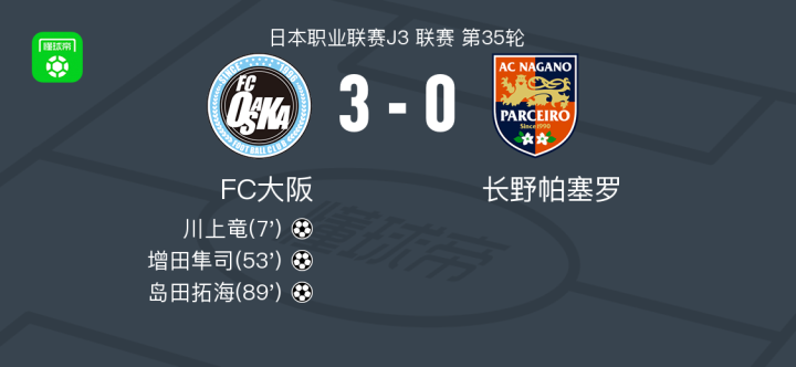 北京时间11月10日,日本职业足球联赛J3联赛第35轮,FC大阪坐镇主场迎战长野帕塞罗。比赛中,秋山拓也送出精准助攻,帮助川上竜率先打破僵局。随后,堤奏一郎成功策动进攻,增田隼司接应破门,进一步扩大领先优势。临近比赛尾声,泽崎凌大助攻岛田拓海再下一城,锁定胜局。最终,FC大阪以3比0战胜长野帕塞罗,全取三分。