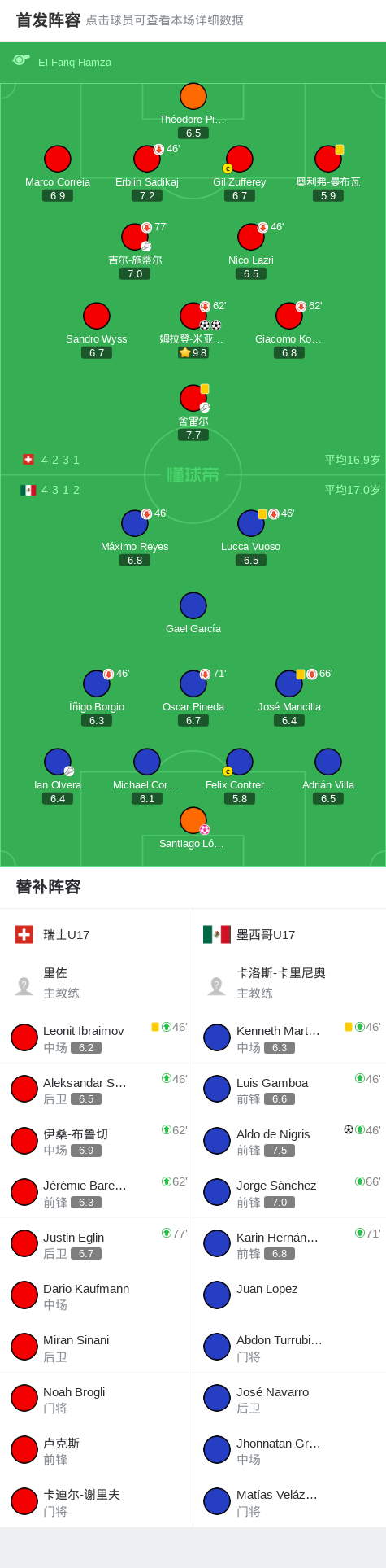 瑞士U17 3-1墨西哥U17,姆拉登-米亚伊洛维奇双响