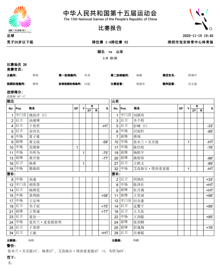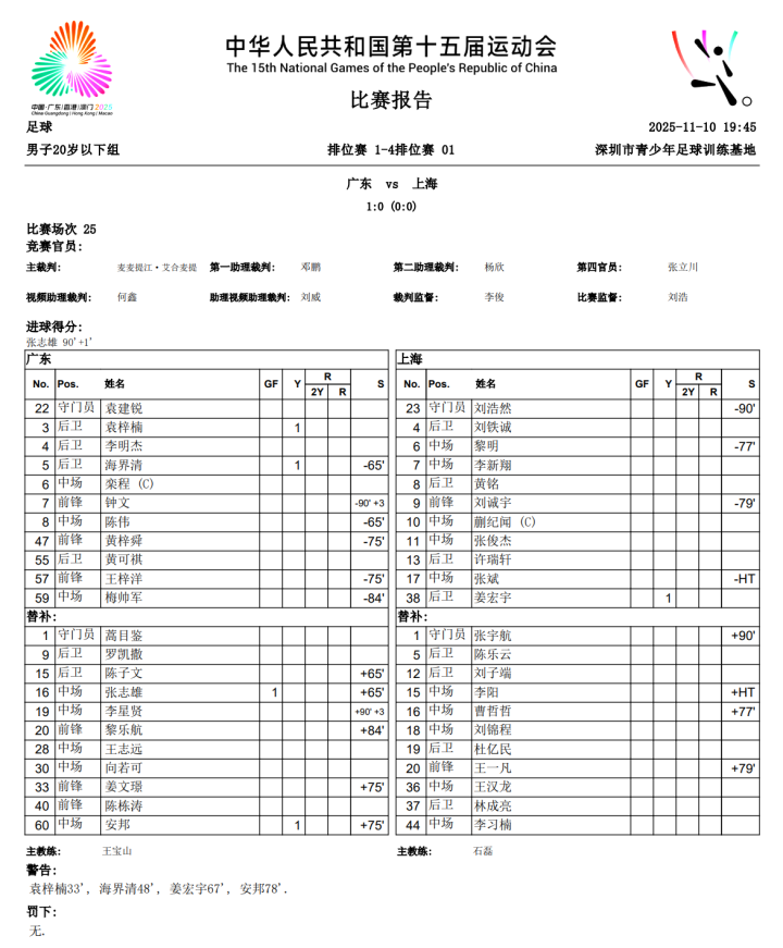 煎饼果子不要钱2025年11月10日19点45分,全国第十五届运动会男子足球U20组结束了半决赛的争夺,广东队和湖北队分别通过伤停补时的点球绝杀对手,会师决赛。决赛将于2天后即11月12日19点45分在深圳市青少年足球训练基地举行,上海队与山东队的铜牌战将于当天稍早的16点在深圳市宝安体育中心体育场进行。