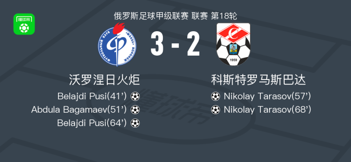 沃罗涅日火炬3-2科斯特罗马斯巴达,Belajdi Pusi两球,Abdula Bagamaev破门
