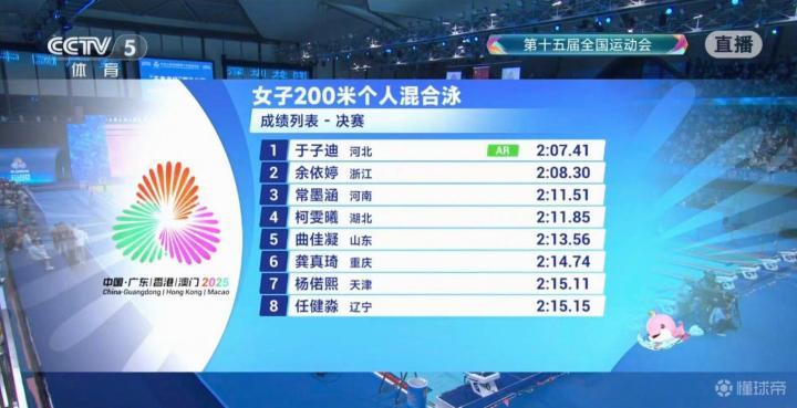 全运会女子200米混合泳:13岁于子迪刷新亚洲纪录,收获金牌gaoniu @懂球帝2025-11-11 20:3111月11日,全运会游泳女子200米混合泳:13岁于子迪2分07秒41刷新叶诗文所保持的亚洲纪录,收获金牌!浙江选手余依婷获得亚军,河南队常墨涵获得铜牌。值得一提的是,13岁的河北小将于子迪打破了中国选手叶诗文在2012年伦敦奥运会创造的亚洲纪录,收获冠军!相关阅读于子迪超越叶诗文,成为女子200米混合泳历史第九快选手 展开更多