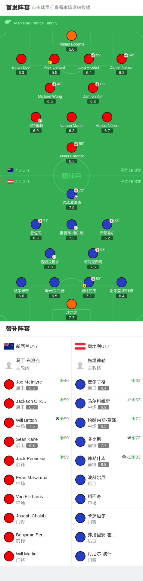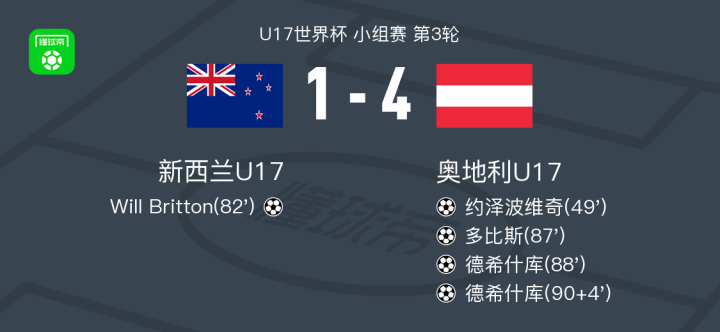 北京时间11月11日U17世界杯 小组赛 第3轮,新西兰U17对阵奥地利U17。新西兰U17Will Britton破门。奥地利U17约泽波维奇破门,多比斯破门,德希什库梅开二度。最终比分新西兰U17 1-4 奥地利U17。