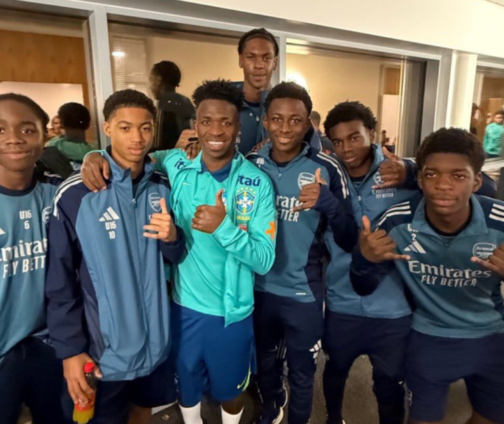 维尼修斯和阿森纳U16球员合影,2米法国门将抢镜