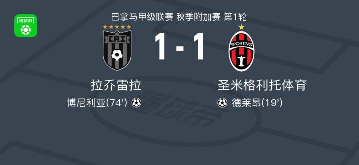 北京时间11月12日,巴拿马甲级联赛秋季附加赛首轮,拉乔雷拉主场迎战圣米格利托体育。比赛中,德莱昂为圣米格利托体育率先破门,随后博尼利亚为拉乔雷拉扳平比分。双方在常规时间内战成1比1平,比赛进入加时赛。
