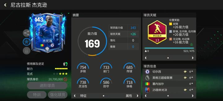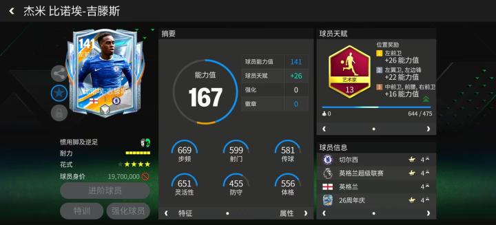 切尔西在今年夏窗的重要引援之一就是签下了英格兰边路吉滕斯,现年21岁的他身价4500万,是又一颗冉冉升起的“大英帝星”。游戏中,创始周年庆活动推出的吉滕斯只有141能力值,但也是一名配备艺术家天赋的边路突破手。