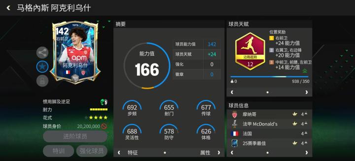 摩纳哥在这个夏窗签下了法蒂、博格巴等备受争议的新援,但在这支球队中,最可靠的进攻球员还是边路宝典阿克利乌什。游戏中,25赛季最佳活动中推出的阿克利乌什能力值达到142,配备了边路超跑天赋,高级油炸丸子花式,是突破犀利的边路爆点。