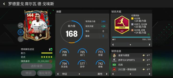 皇马的11号球衣属于巴西球星罗德里戈,尽管名气不如左边路的维尼修斯,但他也凭借自己的实力在俱乐部和国家队站稳了脚跟。游戏中,三国·群雄逐鹿活动推出的144能力值罗德里戈配备了边路超跑天赋,高级油炸丸子花式,边路持球更加稳定。