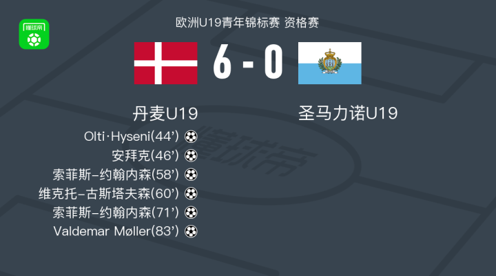 丹麦U19 6-0狂胜圣马力诺U19,索菲斯-约翰内森双响,Valdemar Møller破门