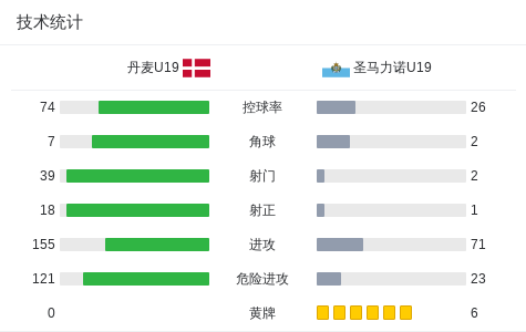 在欧洲U19青年锦标赛资格赛中,丹麦U19与圣马力诺U19展开较量。比赛开始后,丹麦队逐渐掌控节奏,并由Olti·Hyseni率先打破僵局。下半场伊始,安拜克接队友配合完成破门,进一步扩大领先优势。随后,索菲斯-约翰内森在比赛中连入两球,展现出强劲的进攻效率。维克托-古斯塔夫森抓住机会再下一城,帮助球队持续施压。比赛尾声阶段,Valdemar Møller锦上添花,将比分彻底锁定。最终,丹麦U19以6比0战胜对手,全取三分。