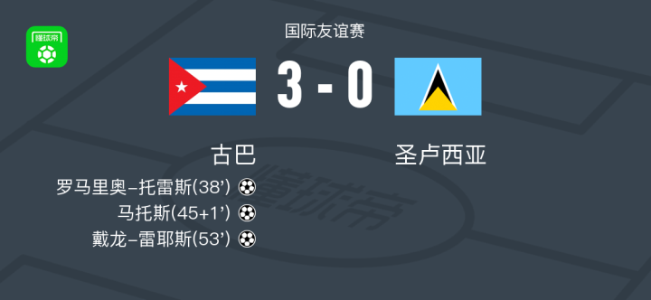 北京时间11月13日国际友谊赛,古巴对阵圣卢西亚。罗马里奥-托雷斯率先打破僵局,为古巴取得领先。随后马托斯在上半场补时阶段再下一城,进一步扩大优势。下半场易边再战,戴龙-雷耶斯接应进攻完成破门,将比分锁定。最终全场比赛结束,古巴以3-0战胜圣卢西亚。