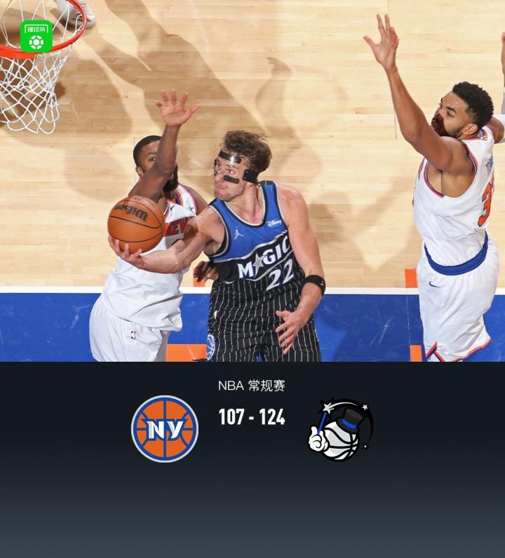 第四节尼克斯布伦森拿下9分,魔术布莱克拿下9分,最终尼克斯107-124不敌魔术