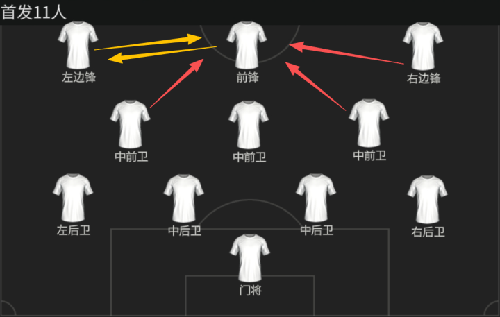 2、阵地进攻不利时,施魏因施泰格、霍华德都可以前插协助,保留配备高级油炸丸子花式,持球能力稳定的费莱尼居中,作为中场接应点即可。