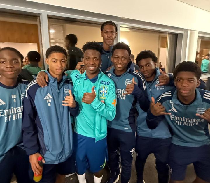 近期,维尼修斯的巴西队在酋长球场训练,皇马巨星也前来和阿森纳U16少年们合照。