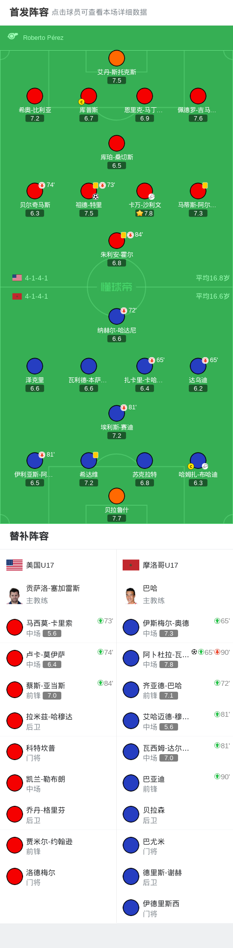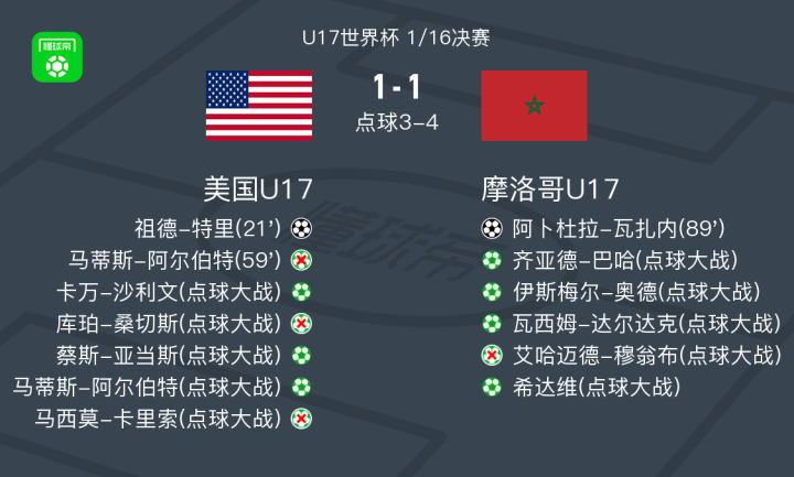 北京时间11月14日U17世界杯 1/16决赛,美国U17对阵摩洛哥U17。美国U17祖德-特里破门。摩洛哥U17阿卜杜拉-瓦扎内破门。最终比分美国U17 4-5 摩洛哥U17。