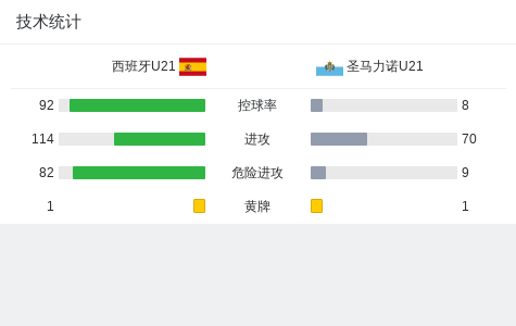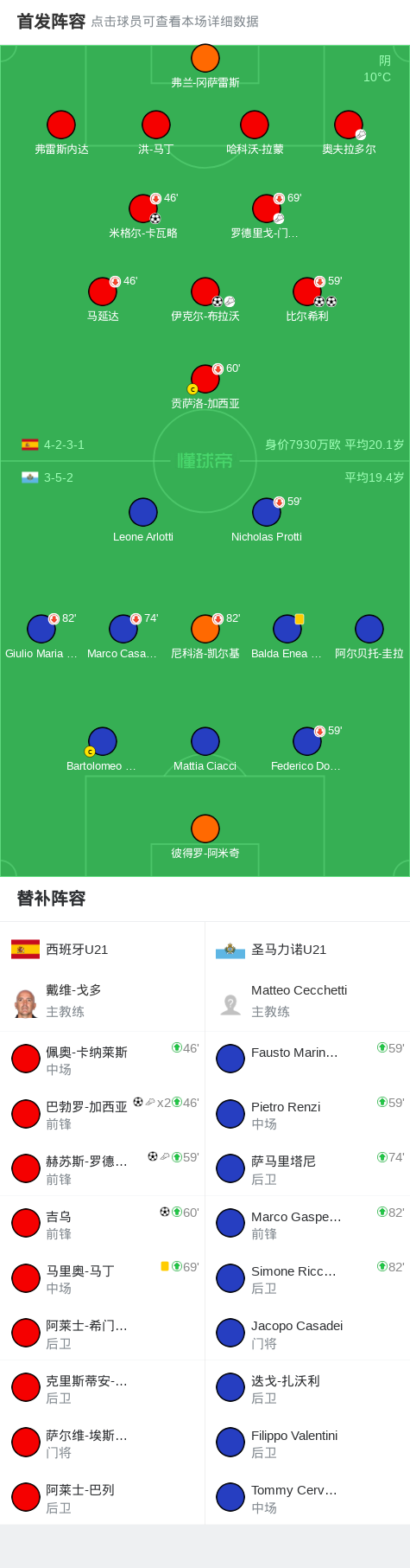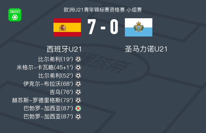 北京时间11月15日欧洲U21青年锦标赛资格赛 小组赛,西班牙U21对阵圣马力诺U21。西班牙U21比尔希利梅开二度,米格尔-卡瓦略破门,伊克尔-布拉沃破门,吉乌破门,赫苏斯-罗德里格斯破门,巴勃罗-加西亚破门。最终比分西班牙U21 7-0 圣马力诺U21。