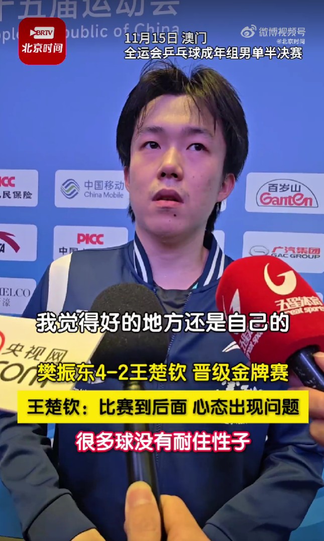 王楚钦:我后面心态出现问题,很多球没有耐住性子gaoniu @懂球帝2025-11-15 14:1611月15日,全运会男单半决赛,“无排名小将”樊振东4-2力克世界第一王楚钦,晋级全运决赛。赛后,王楚钦接受采访时表示:我后面心态出现问题,很多球没有耐住性子。王楚钦:我觉得好的地方还是自己的开局,包括第三局这种焦灼的时候,自己做的都还不错。但是到后面我认为还是自己的心态出现了一些问题,比赛的时候也起伏上来说还是大了一些,很多球有些没耐得住性子。展开更多