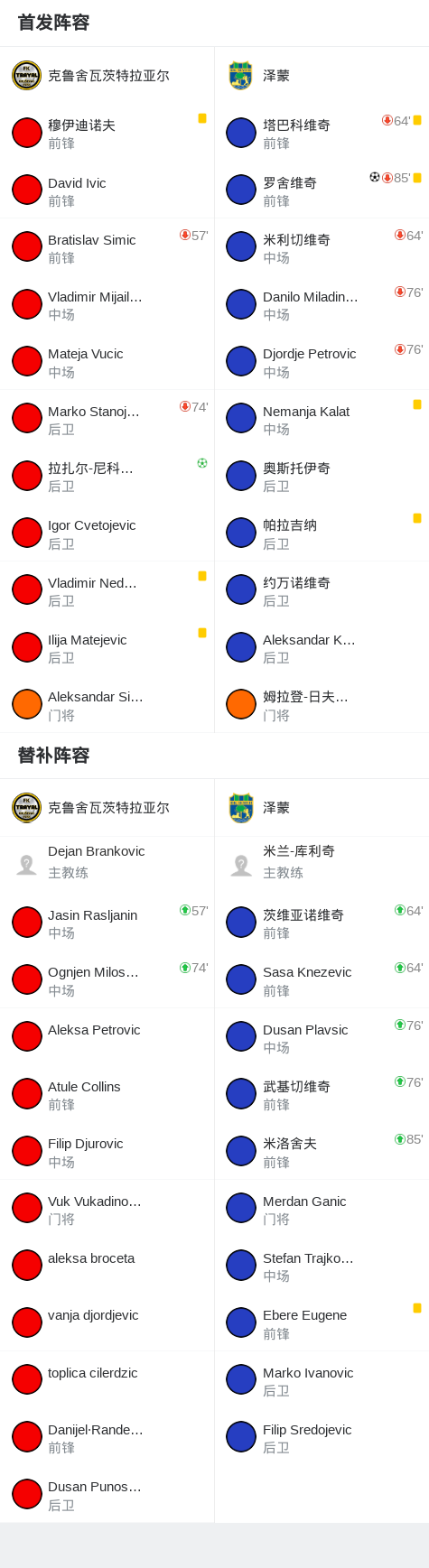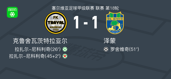 克鲁舍瓦茨特拉亚尔1-1泽蒙,拉扎尔-尼科利奇破门,罗舍维奇救主