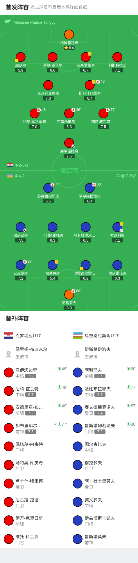 北京时间11月15日U17世界杯 1/16决赛,克罗地亚U17对阵乌兹别克斯坦U17。克罗地亚U17库萨诺维奇破门。乌兹别克斯坦U17哈萨诺夫破门。最终比分克罗地亚U17 4-5 乌兹别克斯坦U17。