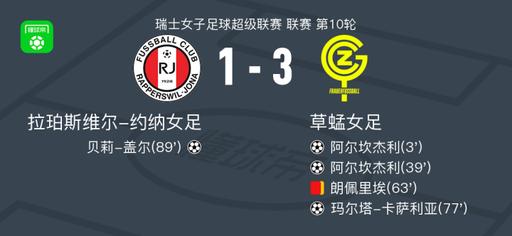 北京时间11月16日,瑞士女子足球超级联赛第10轮展开较量,拉珀斯维尔-约纳女足主场迎战草蜢女足。比赛伊始,草蜢女足迅速进入状态,阿尔坎杰利率先破门,为球队取得领先。上半场临近结束前,阿尔坎杰利再度建功,将比分扩大。易边再战,草蜢女足在防守中遭遇挑战,朗佩里埃累计两张黄牌被罚离场。随后,玛尔塔-卡萨利亚为球队锁定胜局。比赛尾声阶段,贝莉-盖尔为拉珀斯维尔-约纳女足扳回一城。最终全场比赛结束,拉珀斯维尔-约纳女足以1-3不敌草蜢女足。