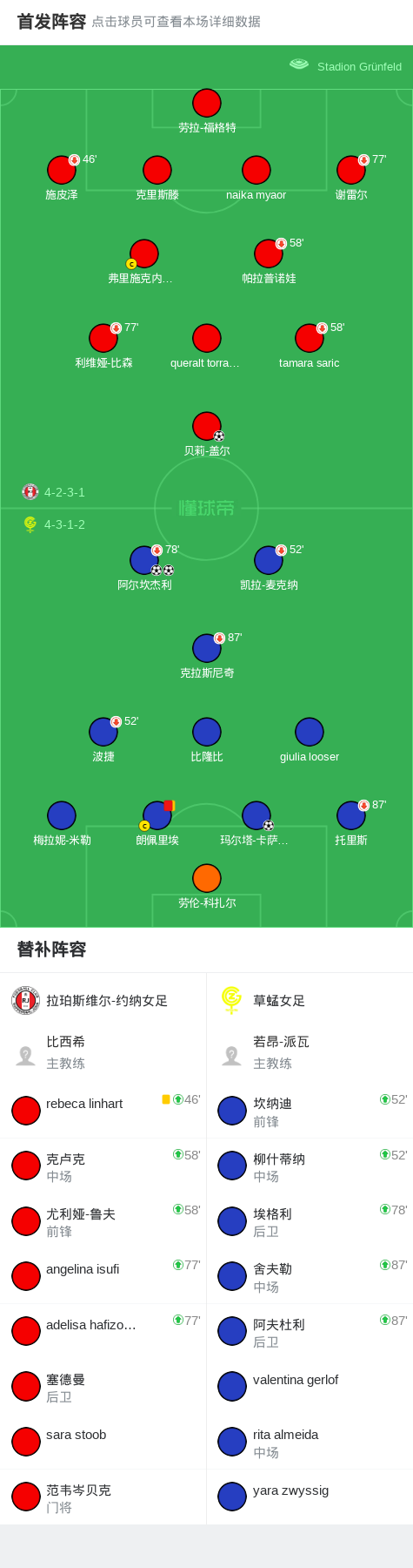草蜢女足3-1拉珀斯维尔-约纳女足,阿尔坎杰利梅开二度,玛尔塔-卡萨利亚建功