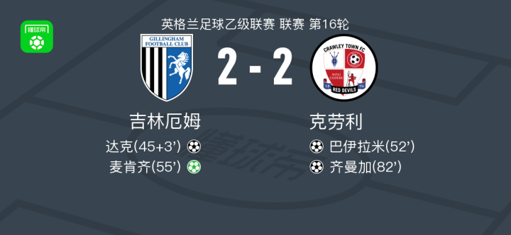 北京时间11月16日,英格兰足球乙级联赛第16轮展开较量,吉林厄姆坐镇主场迎战克劳利。上半场补时阶段,马克斯-克拉克送出助攻,达克推射破门,帮助吉林厄姆取得领先。易边再战,克劳利由哈里-福斯特助攻巴伊拉米扳平比分。随后,吉林厄姆获得点球机会,麦肯齐主罚命中,再度将比分超出。比赛进入尾声阶段,克劳利发动反击,弗林特助攻齐曼加完成破门,最终双方2比2握手言和。