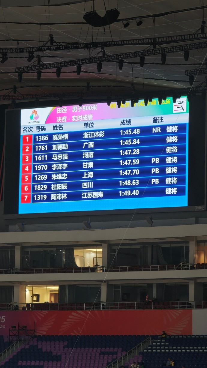 田径男子800米:奚枭横1分45秒48夺得金牌,打破全国纪录gaoniu @懂球帝2025-11-16 20:0111月6日,全运会田径男子800米决赛,浙江队奚枭横1分45秒48夺得金牌,打破全国纪录!广西队刘德助1分45秒84获得银牌。比赛开始之后,奚枭横并没有急于发力,而是跟在队伍中间前进。进入并道线之后,刘德助占据了领先的位置。比赛来到最后的直道阶段,奚枭横突然发力,先是超越了河南队选手马忠强,随后又实现了对刘德助的超越。超越刘德助之后奚枭横继续冲刺,率先冲过终点。展开更多