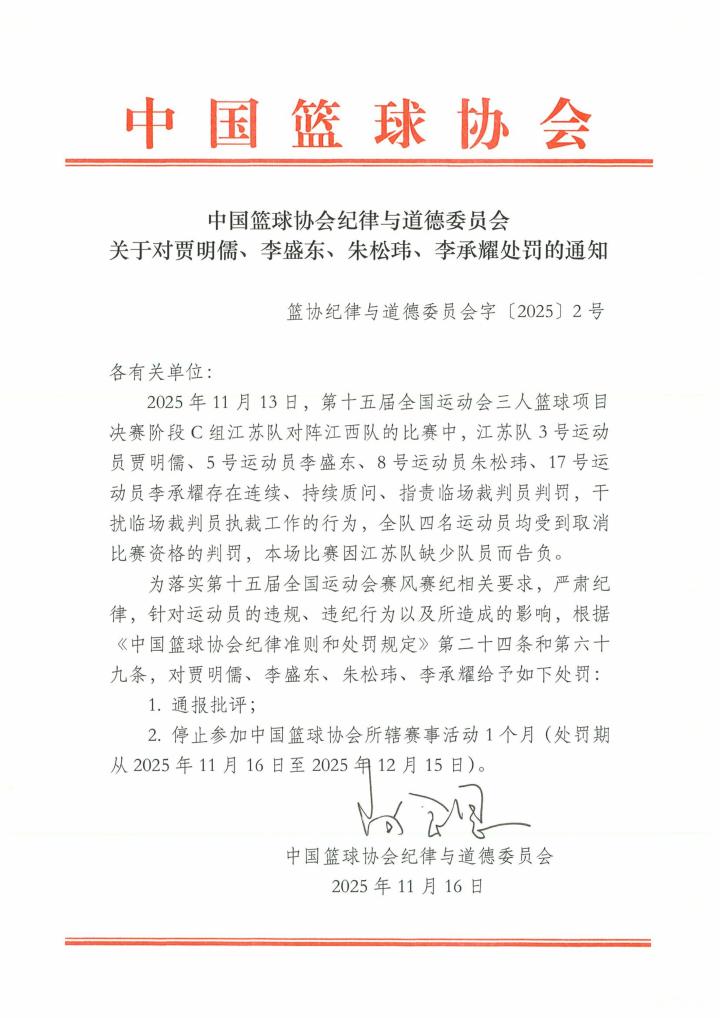 北京时间11月16日,中国篮协官方公布了对于全运会三人篮球项目江苏男篮贾明儒、李盛东、朱松玮、李承耀四名球员的处罚通知,四名球员将被禁赛1个月。
