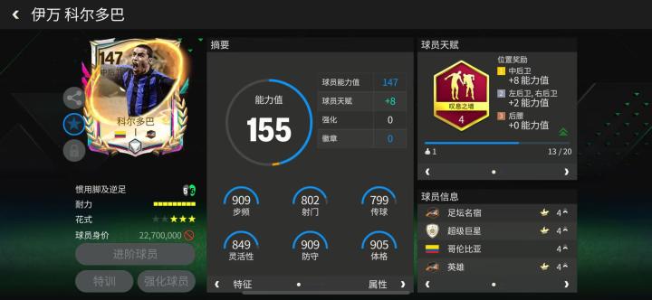 科尔多巴是一名身材矮小却作风凶悍的哥伦比亚传奇后卫。足球多元宇宙活动中,他的全新球员卡能力值为147。天赋方面,叹息之墙对他的速度、人盯人等数据提升显著。低+高的攻守效率也能让科尔多巴在防守端的存在感显著提升