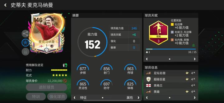 麦克马纳曼成名于利物浦,后随皇马两夺欧冠冠军。足球多元宇宙活动中,他的全新球员卡能力值为146。天赋方面,他配备了边锋常见的猎鹰,对加速、盘带等多项关键数据提升显著,高级油炸丸子搭配五星花式星级让他的持球进攻更加出色。
