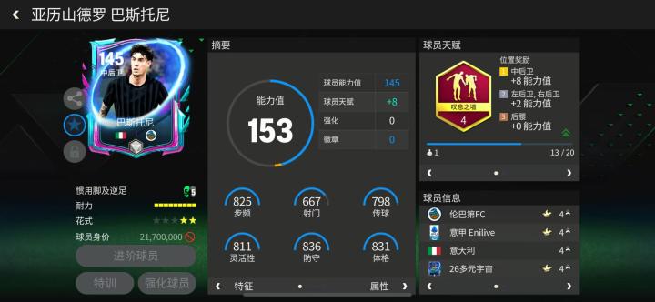 巴斯托尼是国际米兰复兴的后防核心,也是意大利2021年问鼎欧洲之巅的成员之一。多元宇宙巴斯托尼配备了叹息之墙天赋,着重提升了他的防守端数据,高大的身材以及灵活的反应速度让巴斯托尼在场上的防守表现更为全面。