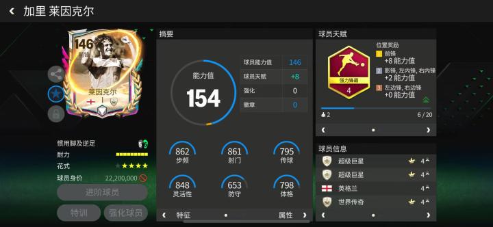 莱因克尔职业生涯零红牌,他以正直品格与超高进球率著称。足球多元宇宙活动中,他的球员卡能力值为146。天赋方面,他配备了强力锋霸,对得分相关的多项数据提升显著。四星的花式星级搭配高级油炸丸子的花式配置确保了他的盘带过人能力。