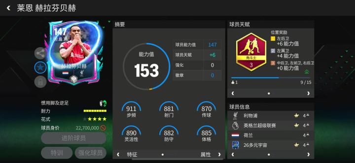 赫拉芬贝赫在现实中常以中前卫为主,足球多元宇宙活动中,他推出了一张左后卫位置球员卡。天赋配备了角斗士,对他攻守两端多项数据都有提升,马赛回旋花式搭配四星花式星级,身材高大的赫拉芬贝赫持球进攻表现也相当不错。