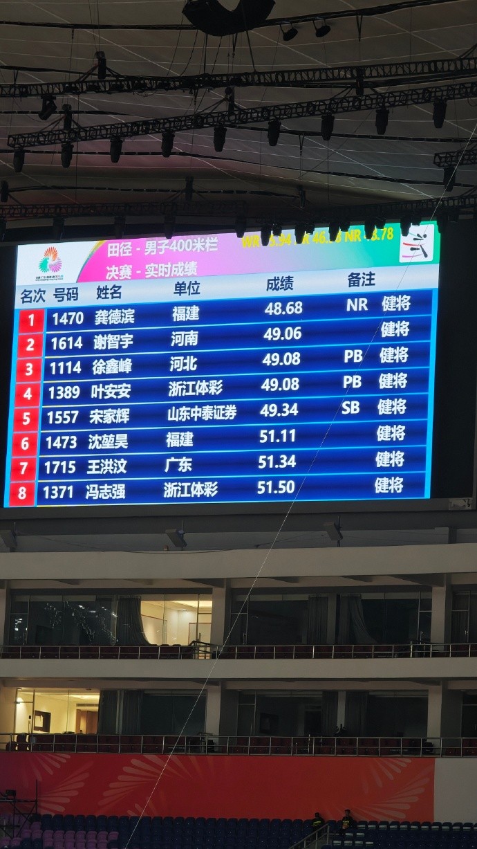 田径男子400米栏:龚德滨48秒68打破全国纪录夺冠,谢智宇第二gaoniu @懂球帝2025-11-17 20:0611月17日,全运会田径男子400米栏决赛:龚德滨48秒68打破全国纪录获得金牌,谢智宇49秒06银牌、徐鑫峰49秒08(.072)铜牌,同时创造个人最好成绩。值得一提的是,龚德滨48秒68打破了谢智宇曾在2023年成都第31届世界大学生夏季运动会创造的48秒78的全国纪录。该项目世界纪录是卡斯滕-沃霍尔姆创造的45秒94。亚洲纪录则是阿卜杜拉赫曼-桑巴在2018年创造的46秒98。展开更多